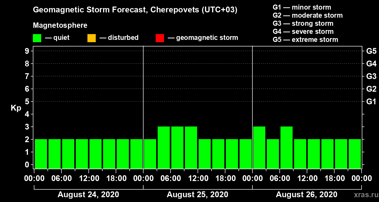 Geomagnetic storm forecast in Cherepovets for Aug 24, 2020
