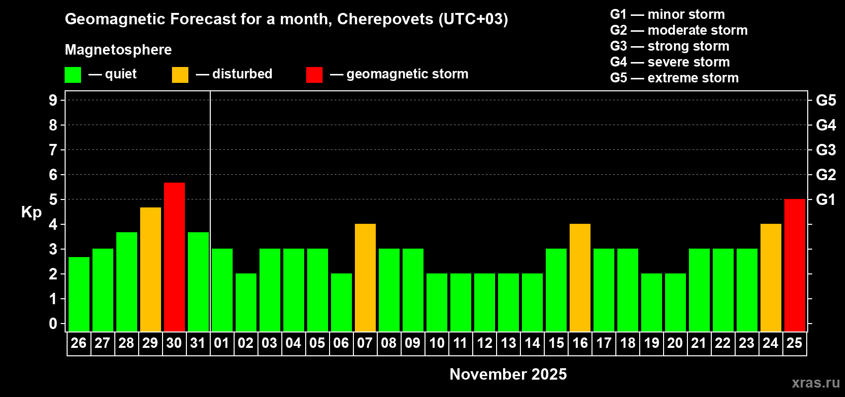 Geomagnetic activity forecast in Cherepovets — Oct 26, 2025