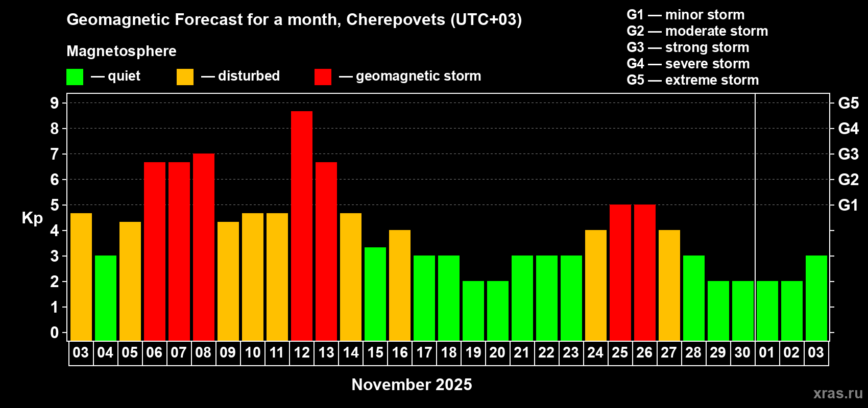 Geomagnetic storm forecast in Cherepovets for Nov 03, 2025