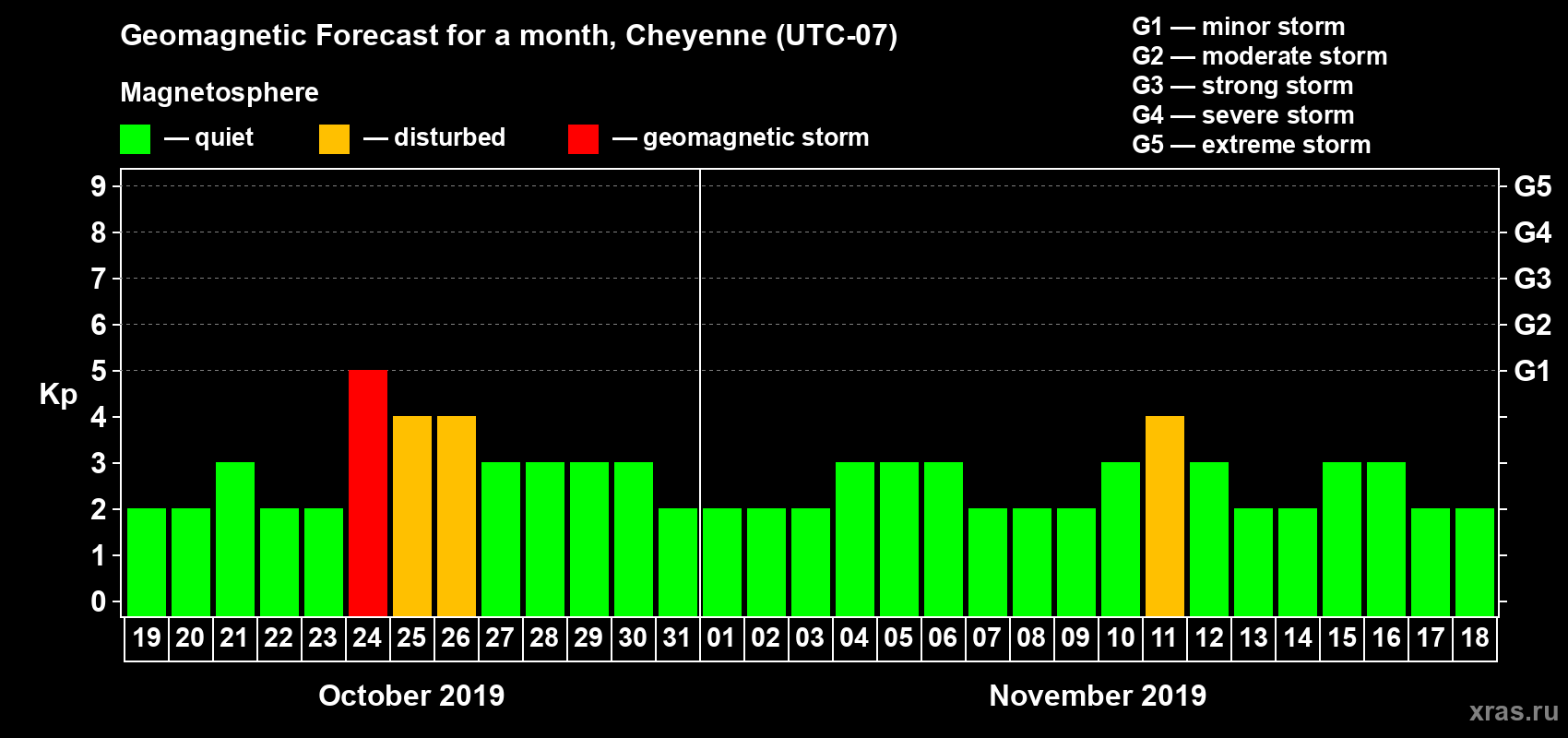 Geomagnetic storm forecast in Cheyenne for Oct 19, 2019