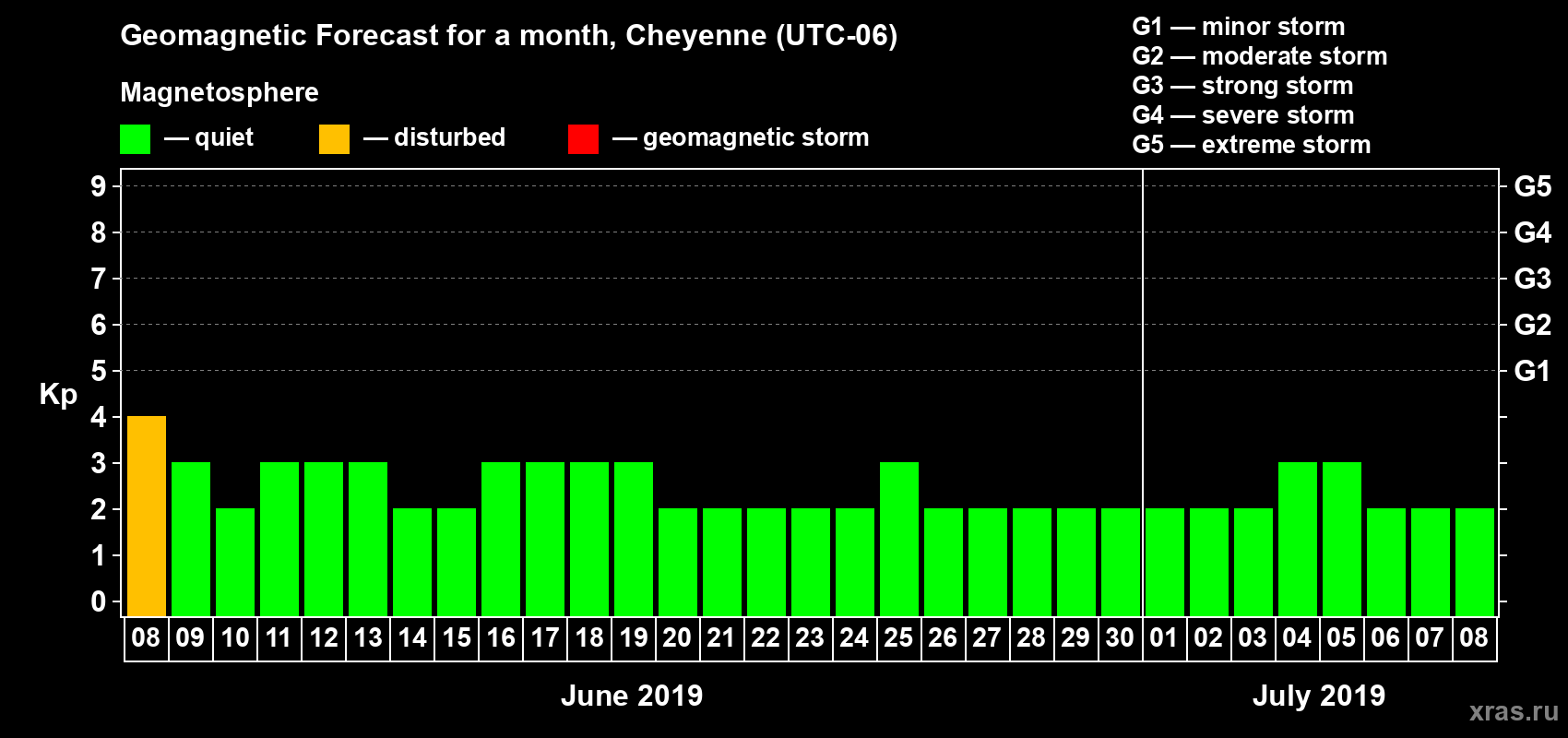 Geomagnetic storm forecast in Cheyenne for Jun 08, 2019