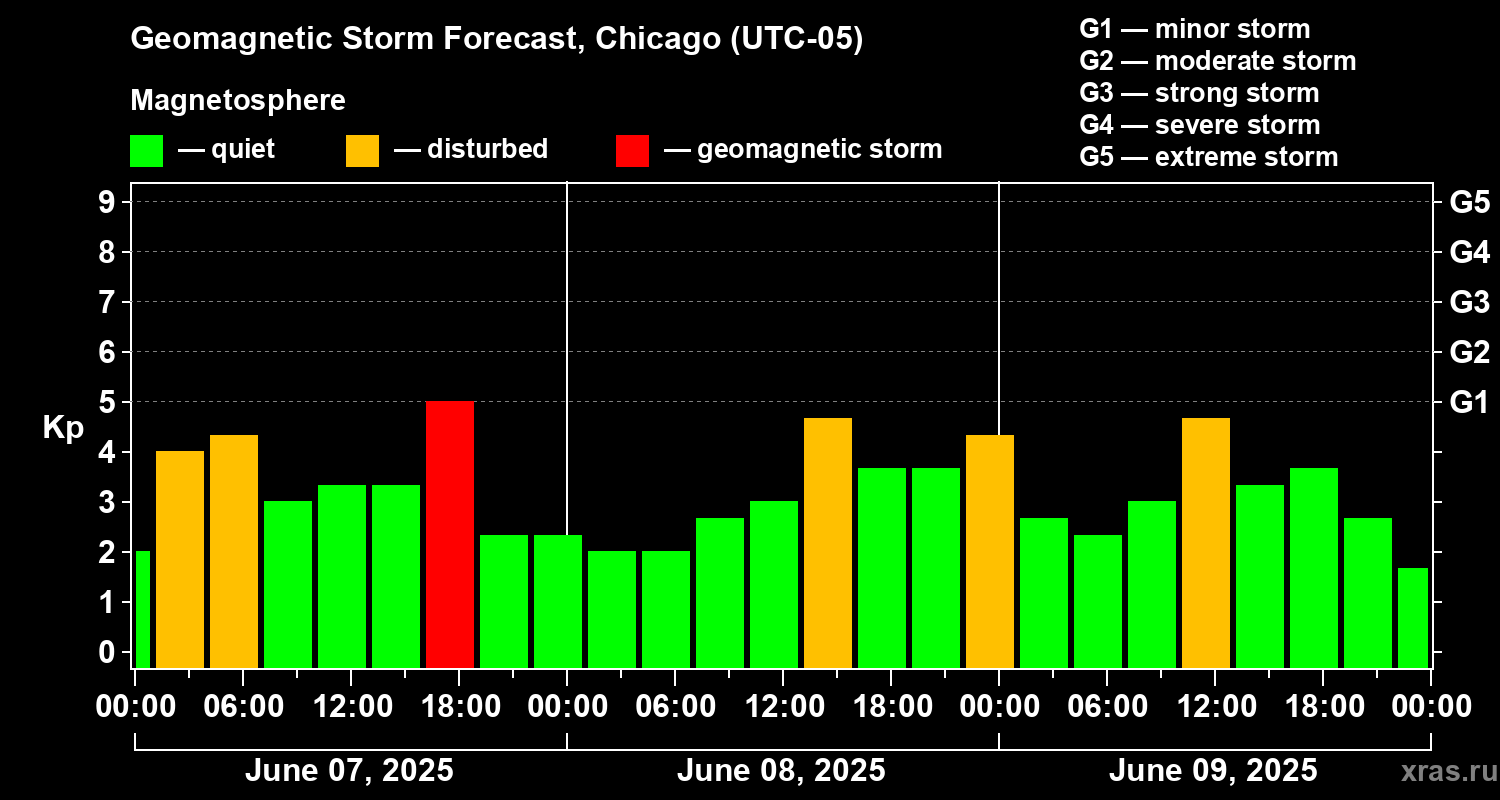 Geomagnetic storm forecast in Chicago for Jun 07, 2025