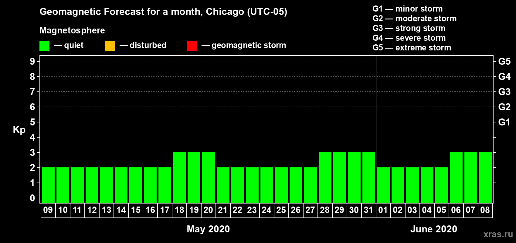 Geomagnetic storm forecast in Chicago for May 09, 2020
