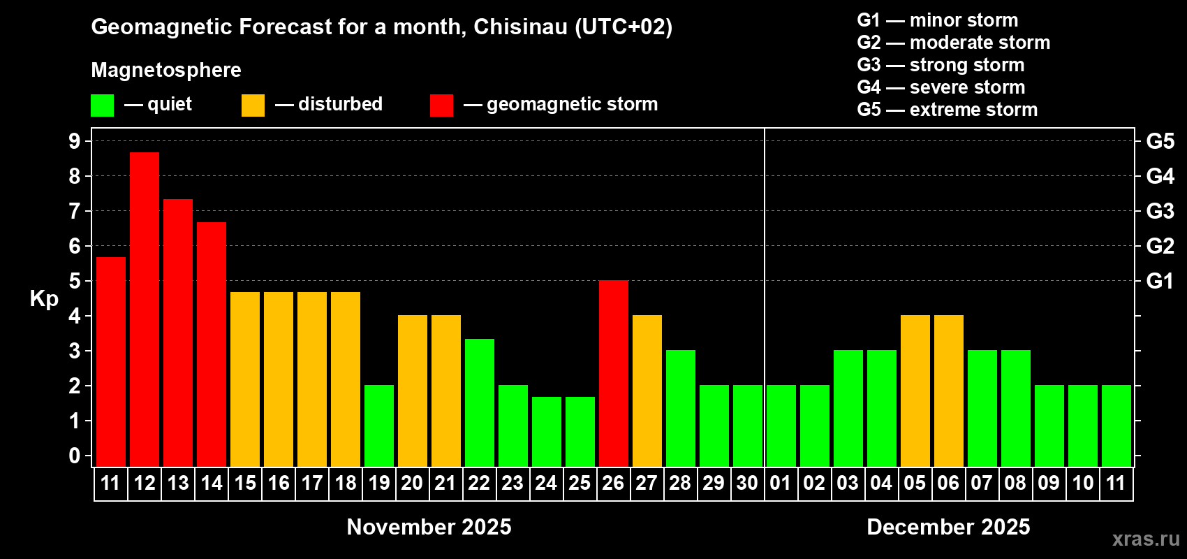 Geomagnetic storm forecast in Chisinau for Nov 11, 2025