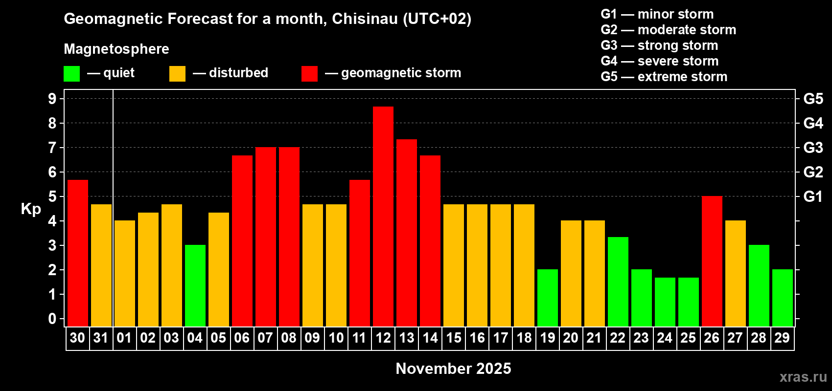Geomagnetic storm forecast in Chisinau for Oct 30, 2025