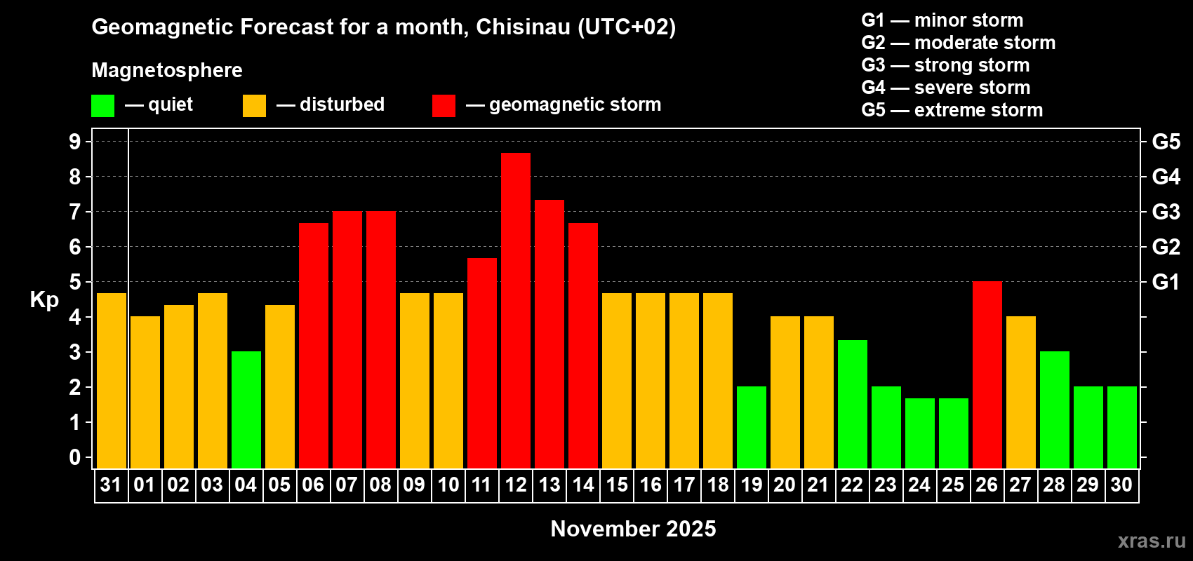 Geomagnetic storm forecast in Chisinau for Oct 31, 2025