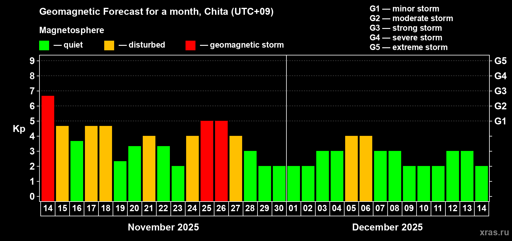 Geomagnetic storm forecast in Chita for Nov 14, 2025