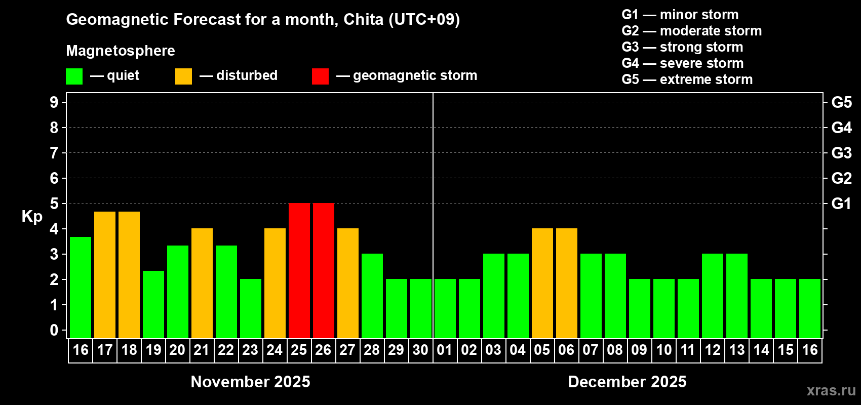 Geomagnetic storm forecast in Chita for Nov 16, 2025