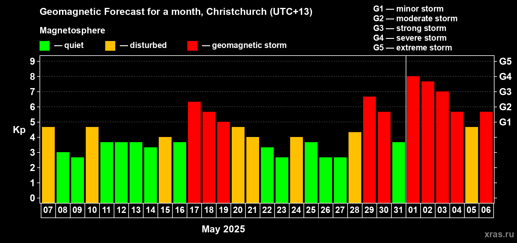 Geomagnetic storm forecast in Christchurch for May 07, 2025
