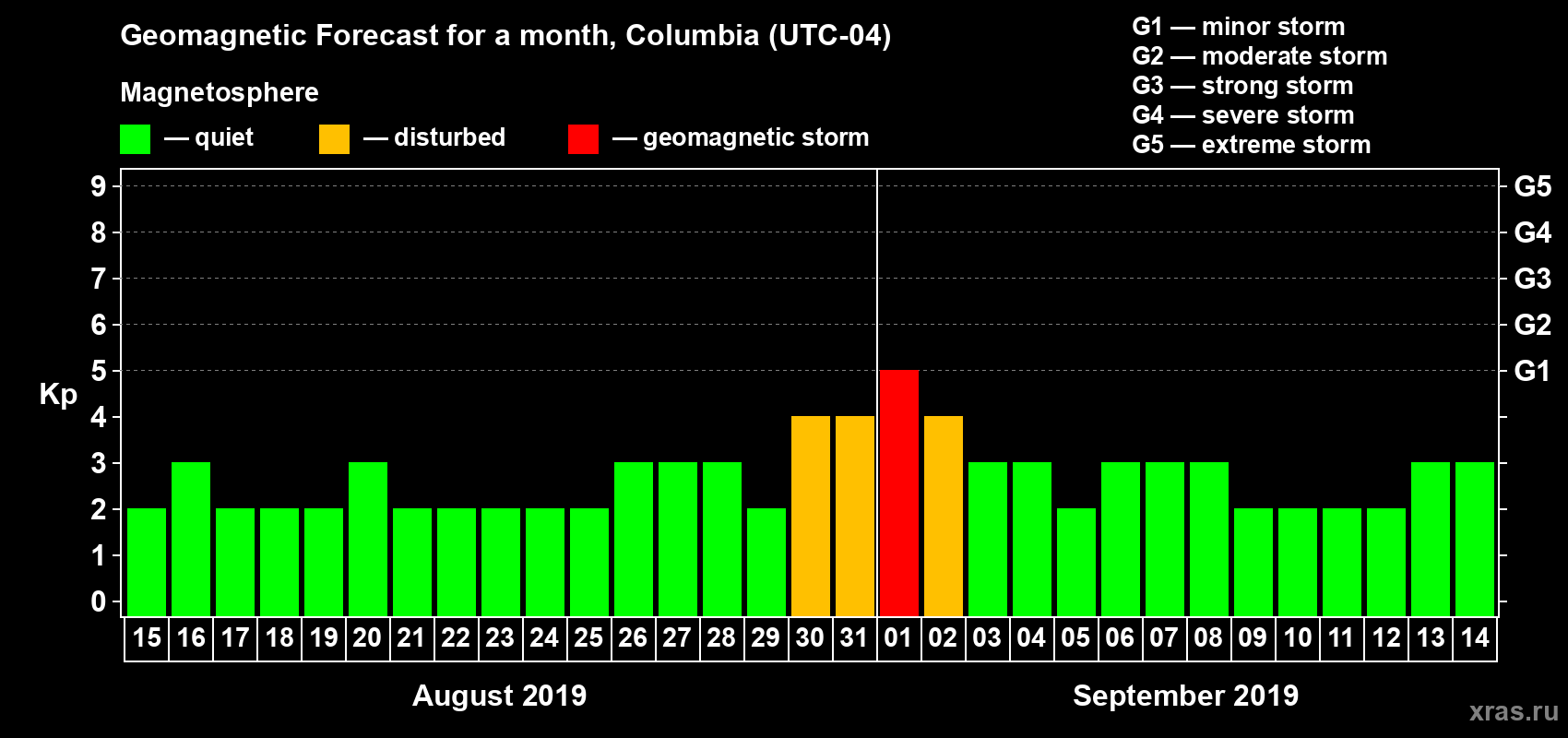Geomagnetic storm forecast in Columbia for Aug 15, 2019