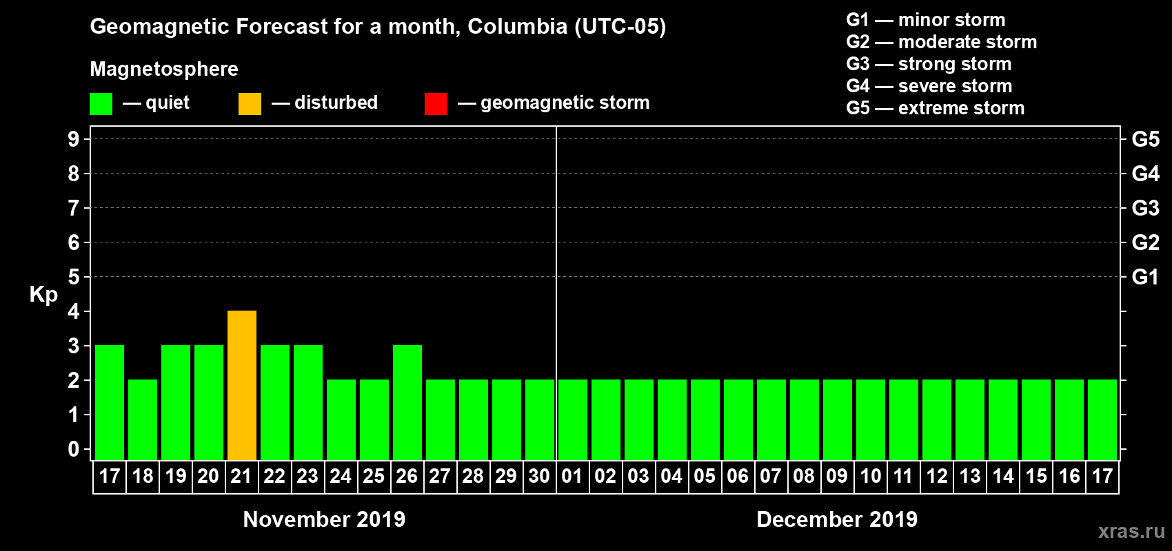 Geomagnetic storm forecast in Columbia for Nov 17, 2019