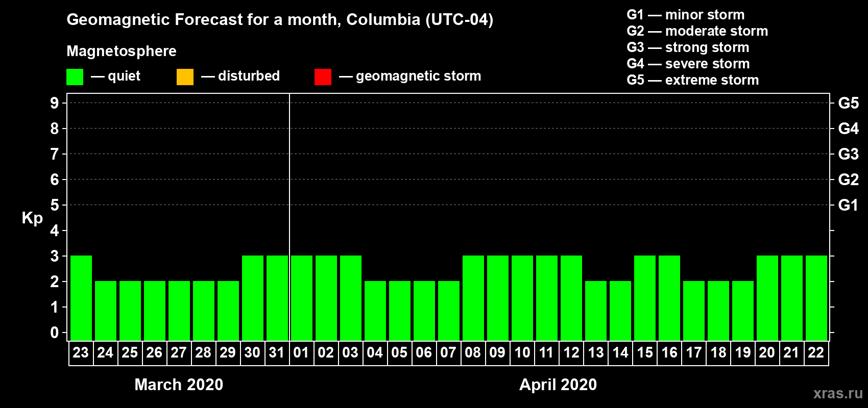 Geomagnetic storm forecast in Columbia for Mar 23, 2020