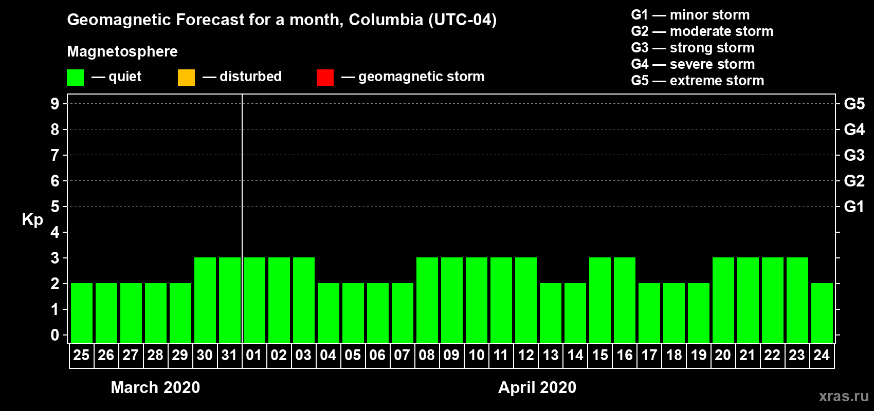 Geomagnetic storm forecast in Columbia for Mar 25, 2020