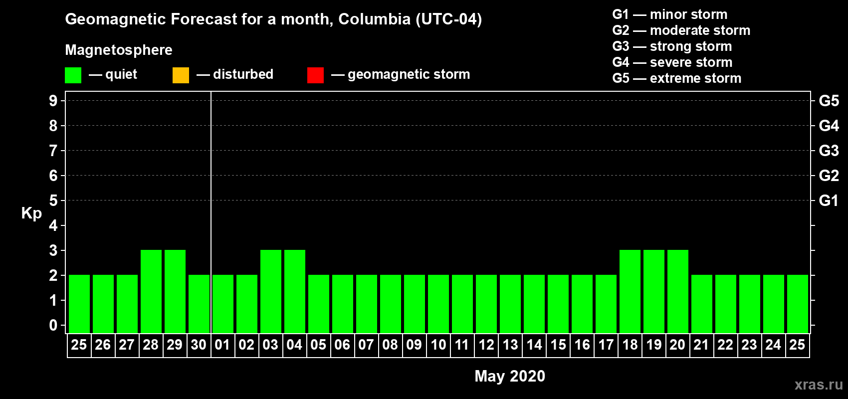Geomagnetic storm forecast in Columbia for Apr 25, 2020