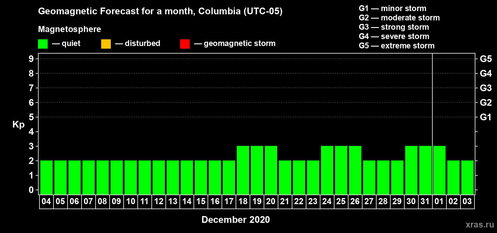 Geomagnetic storm forecast in Columbia for Dec 04, 2019