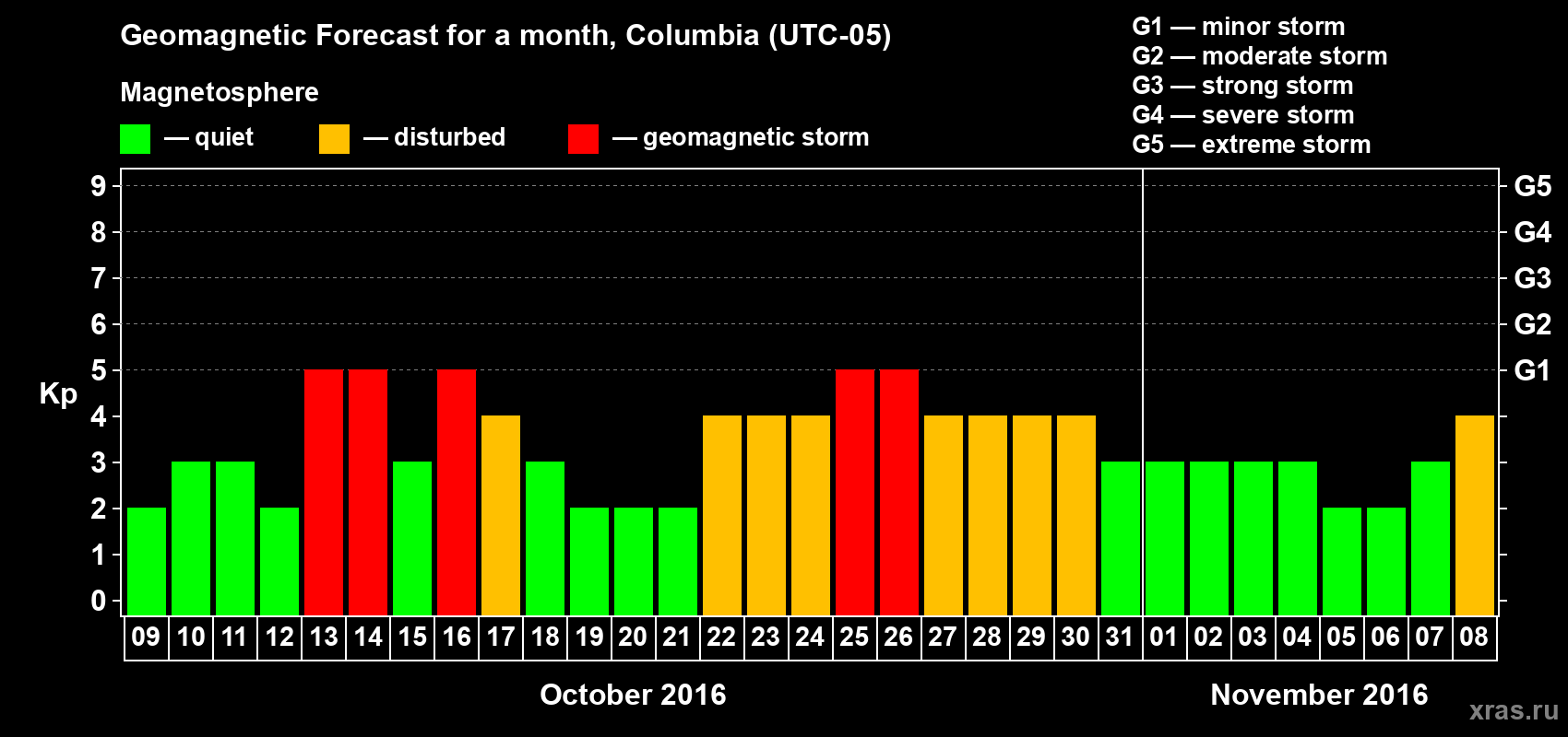 Geomagnetic storm forecast in Columbia for Oct 09, 2016