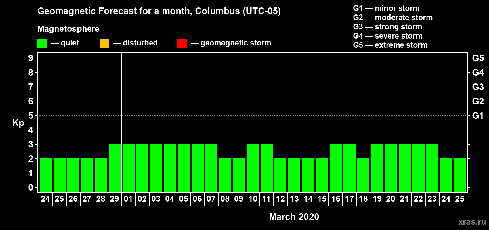 Geomagnetic storm forecast in Columbus for Feb 24, 2020