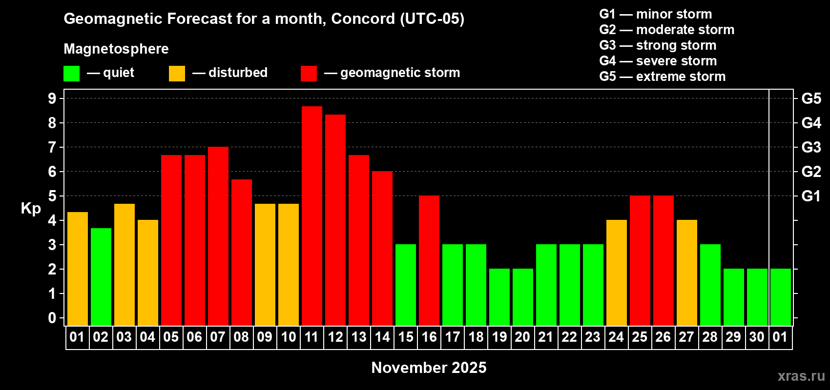 Geomagnetic storm forecast in Concord for Nov 01, 2025