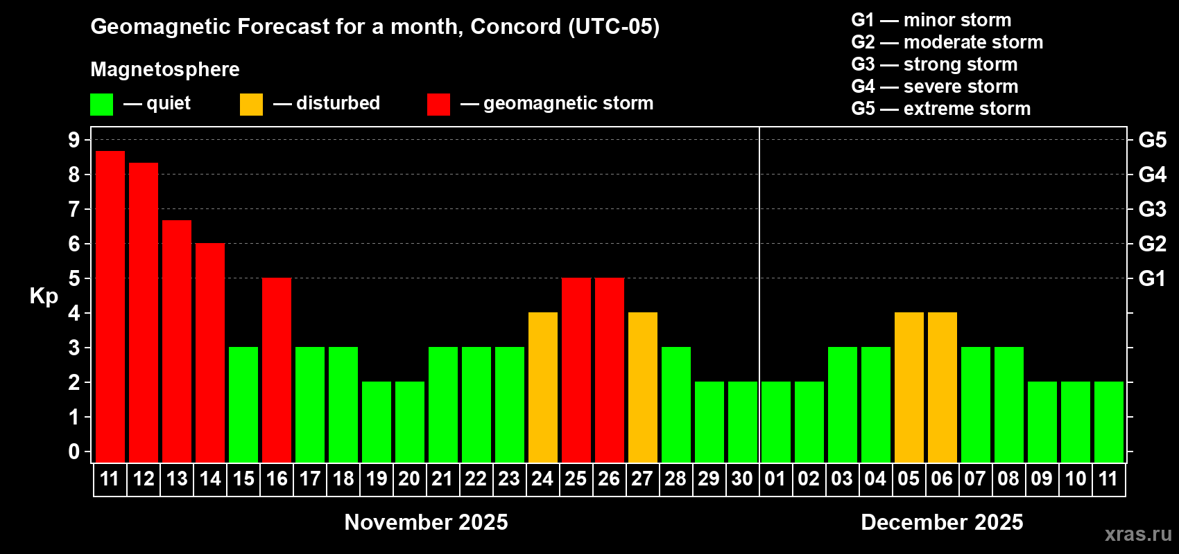 Geomagnetic storm forecast in Concord for Nov 11, 2025