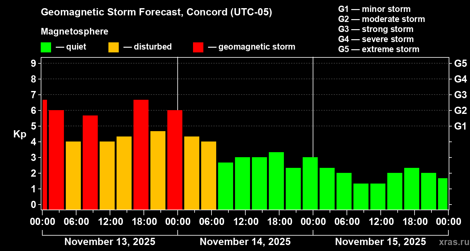 Geomagnetic storm forecast in Concord for Nov 13, 2025