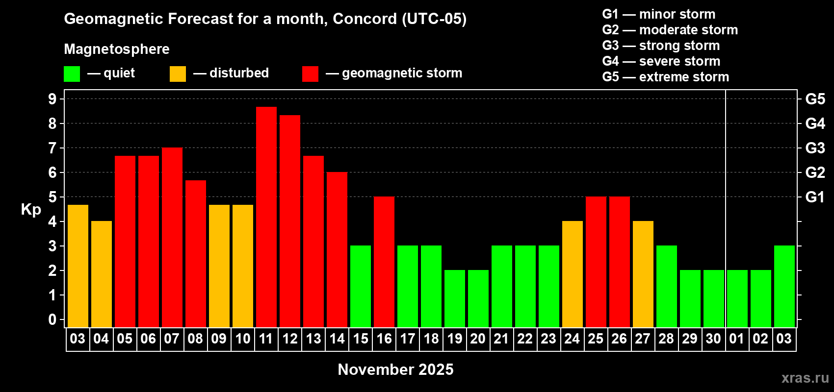 Geomagnetic storm forecast in Concord for Nov 03, 2025