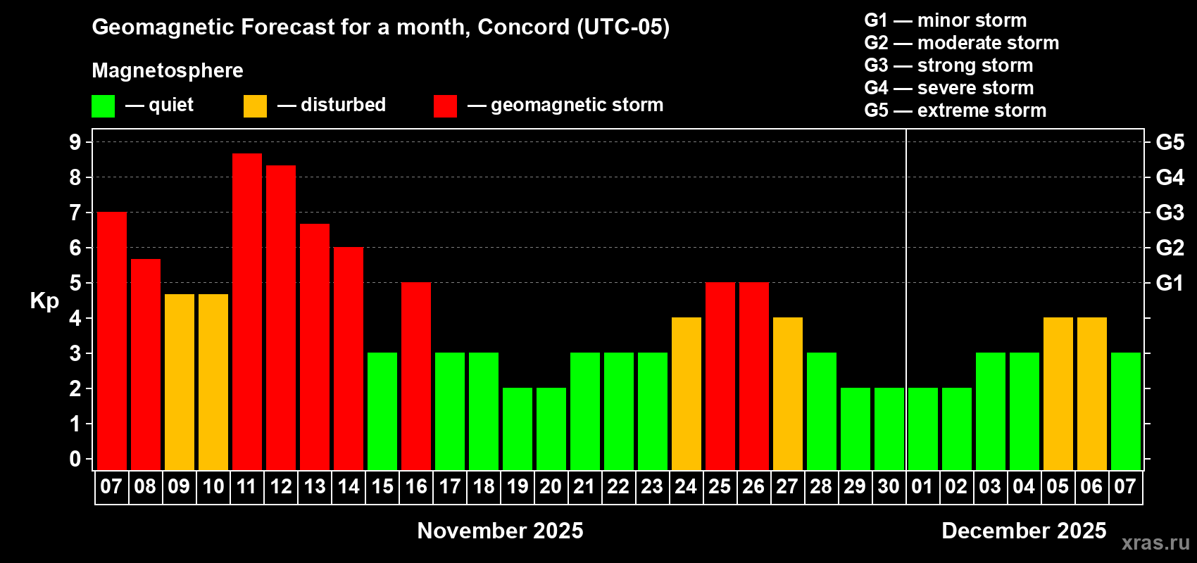 Geomagnetic storm forecast in Concord for Nov 07, 2025