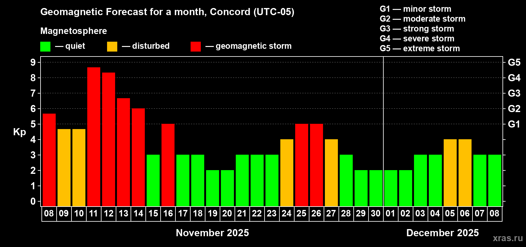 Geomagnetic storm forecast in Concord for Nov 08, 2025