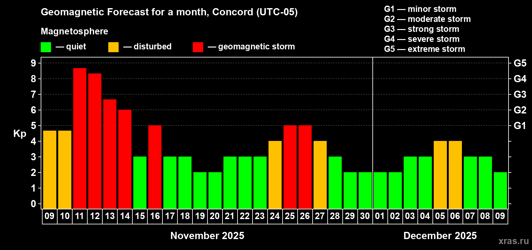 Geomagnetic storm forecast in Concord for Nov 09, 2025