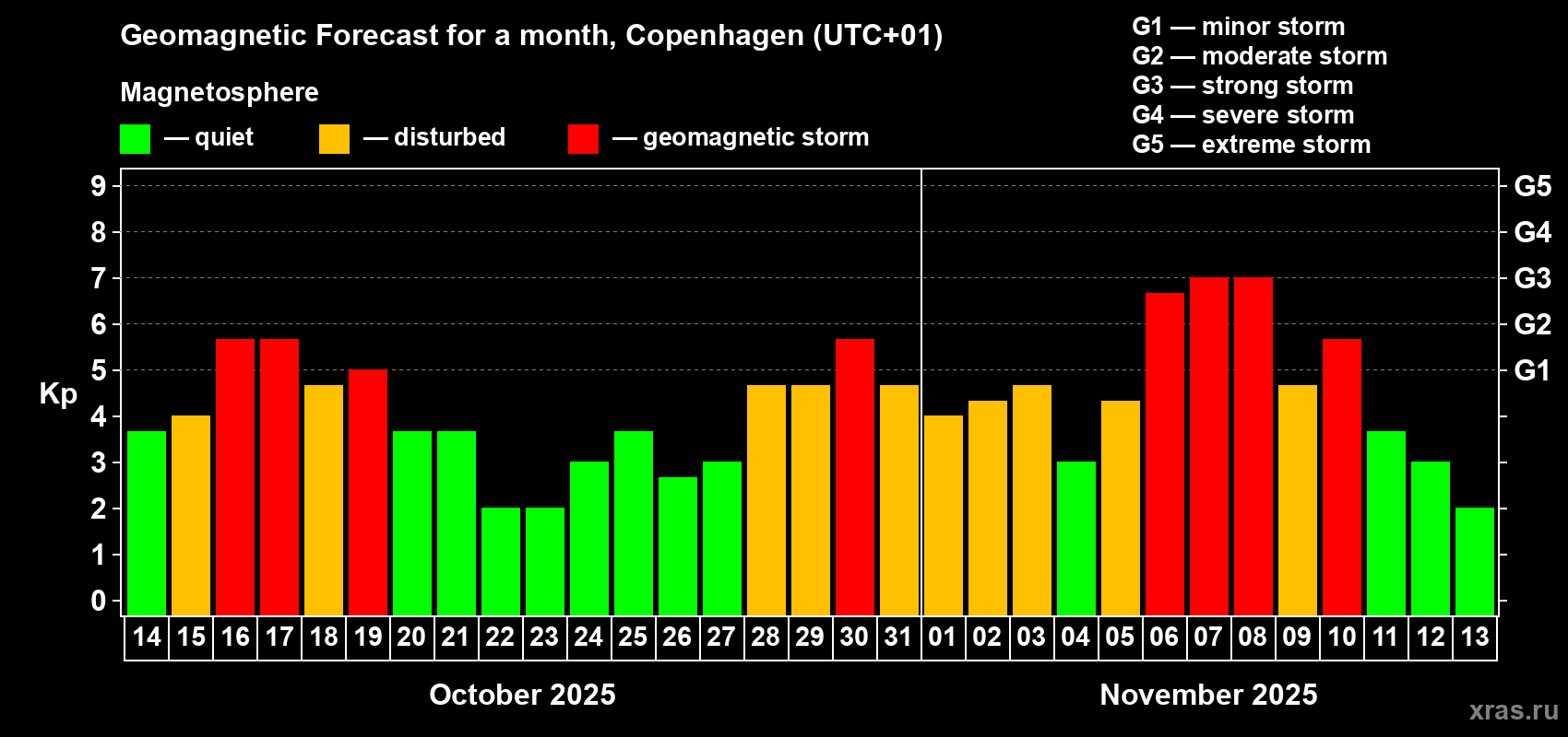 Geomagnetic storm forecast in Copenhagen for Oct 14, 2025