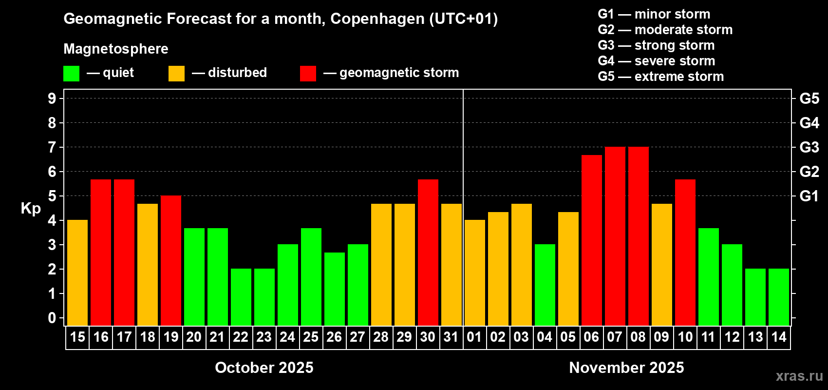 Geomagnetic storm forecast in Copenhagen for Oct 15, 2025