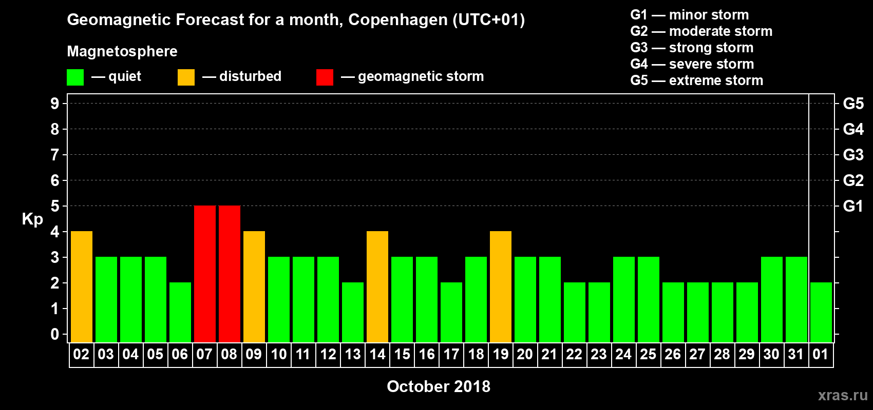 Geomagnetic storm forecast in Copenhagen for Oct 02, 2018