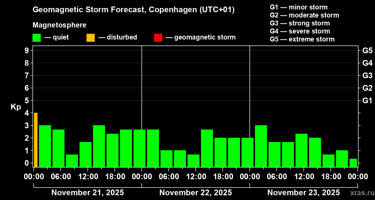 Geomagnetic storm forecast in Copenhagen for Nov 21, 2025