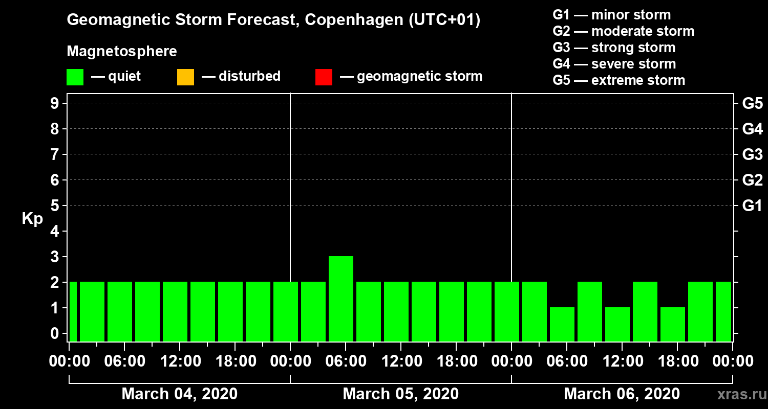 Geomagnetic storm forecast in Copenhagen for Mar 04, 2020