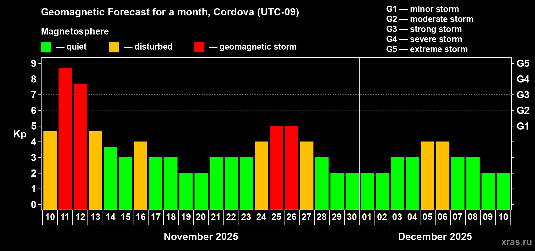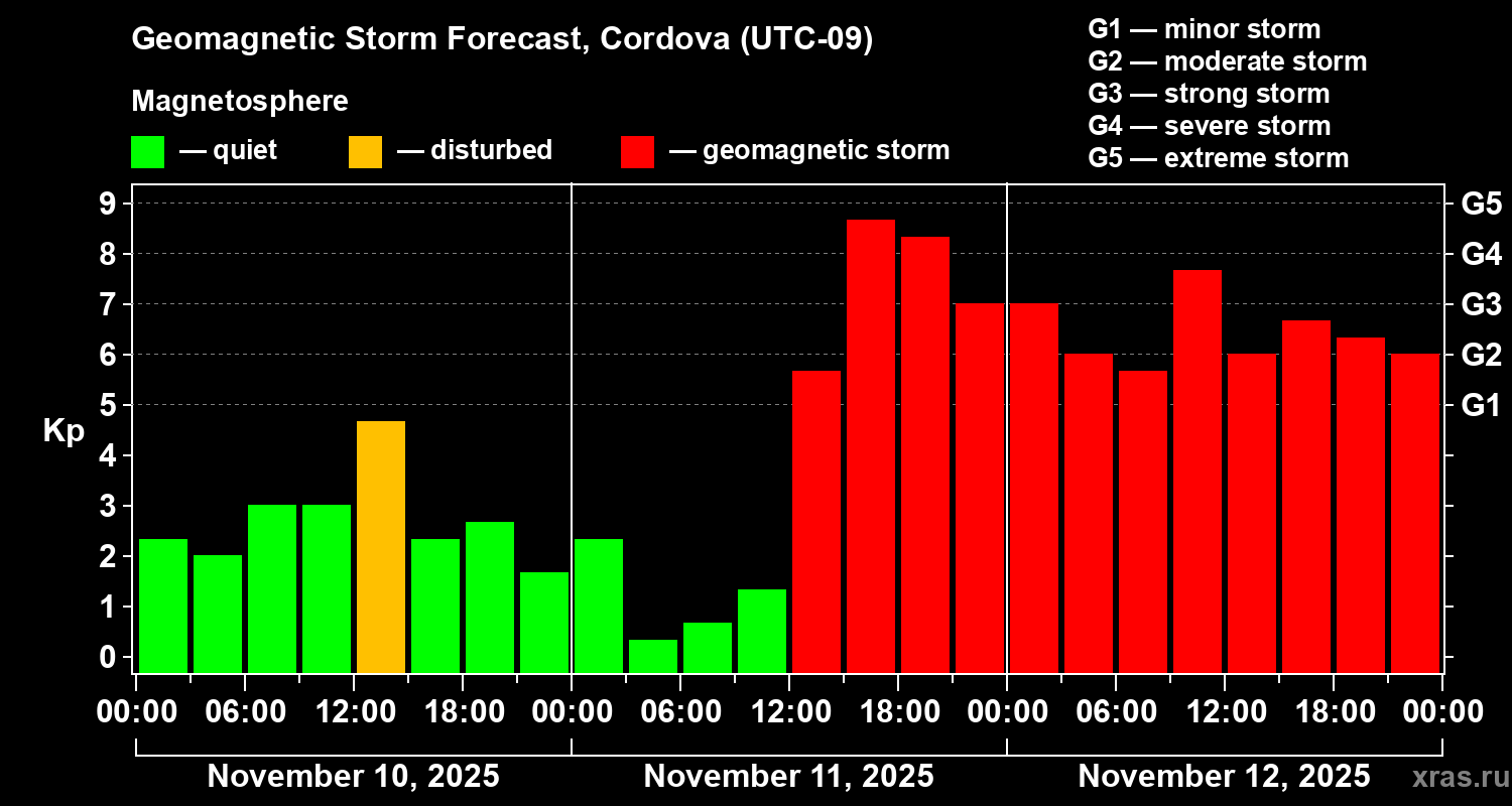 Geomagnetic storm forecast in Cordova for Nov 10, 2025
