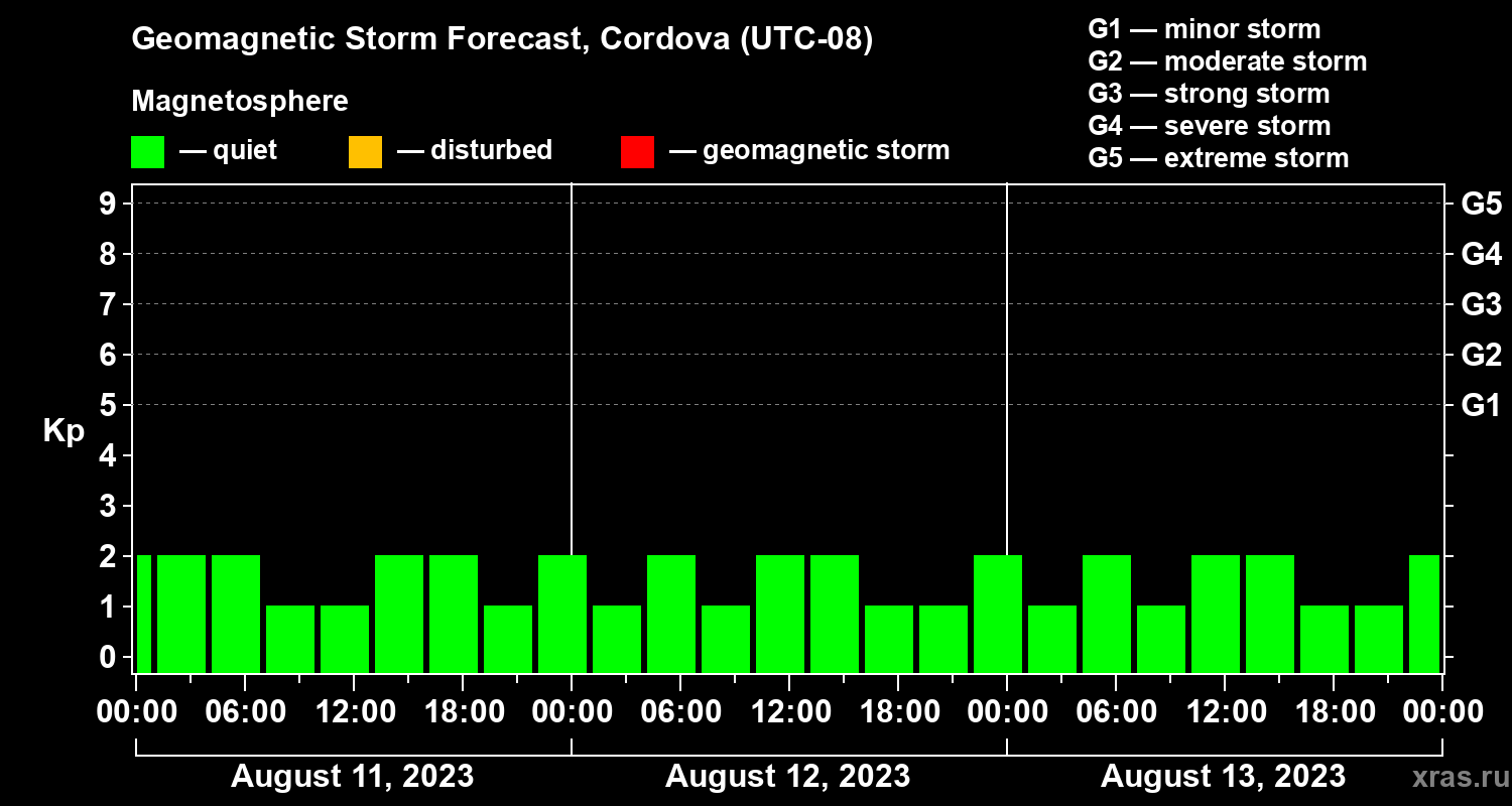 Geomagnetic activity forecast in Cordova — Aug 11, 2023