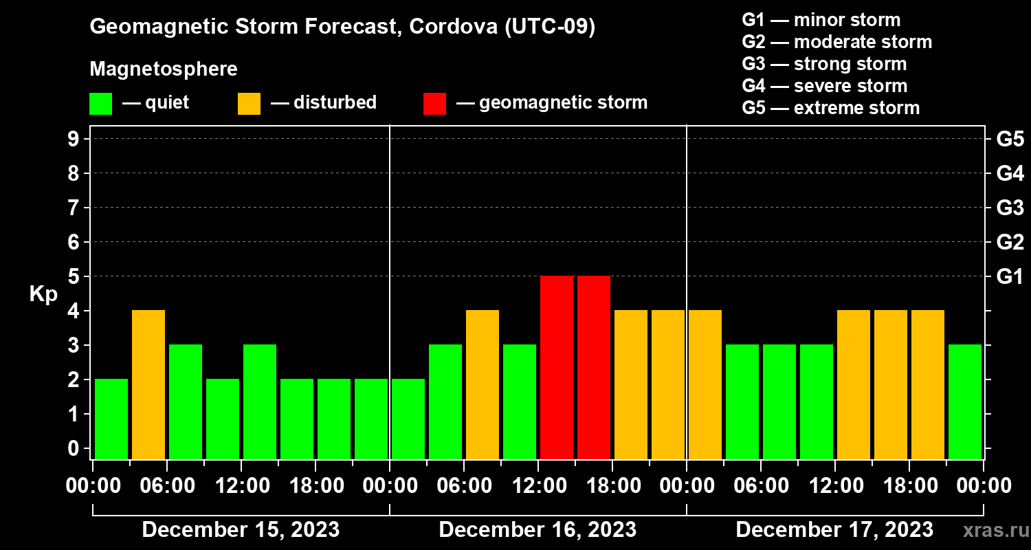 Geomagnetic storm forecast in Cordova for Dec 15, 2023