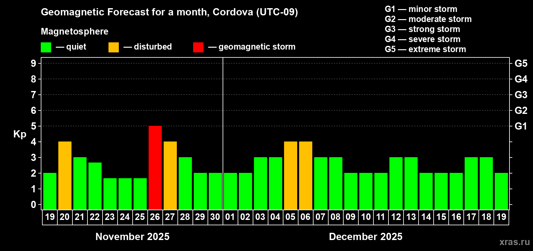 Geomagnetic storm forecast in Cordova for Nov 19, 2025