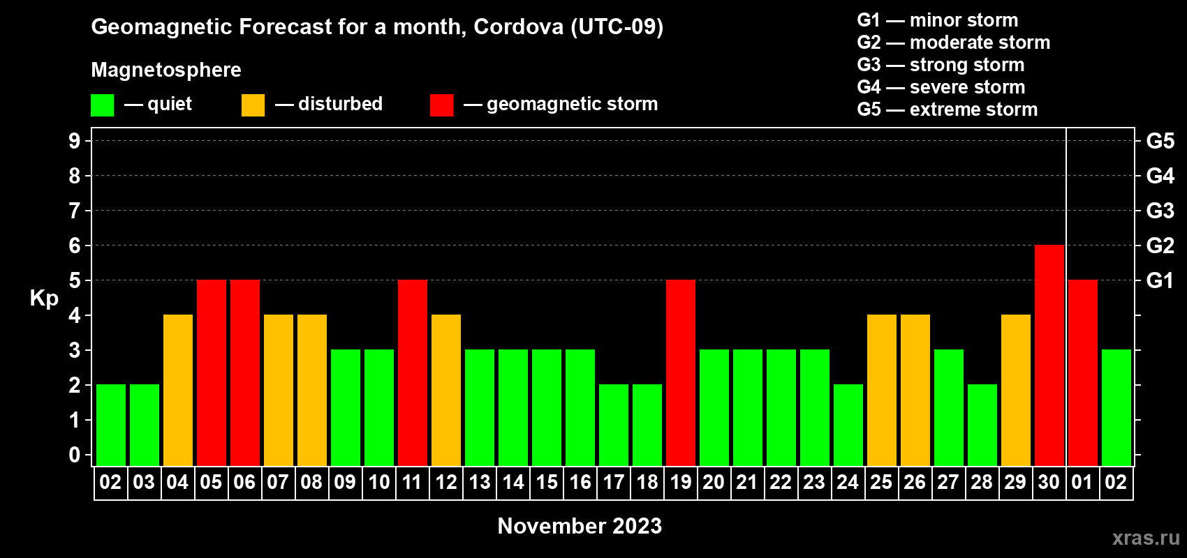Geomagnetic storm forecast in Cordova for Nov 02, 2023