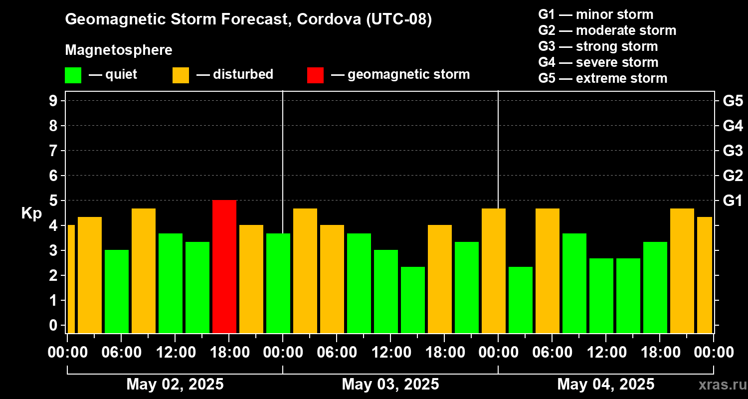 Geomagnetic storm forecast in Cordova for May 02, 2025