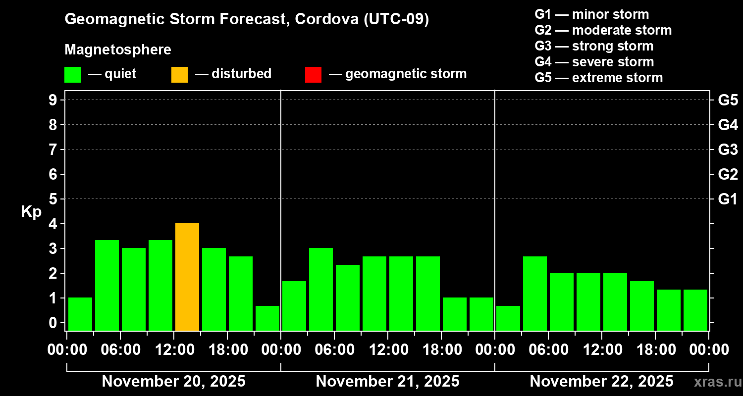 Geomagnetic storm forecast in Cordova for Nov 20, 2025