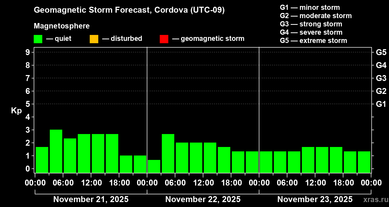 Geomagnetic storm forecast in Cordova for Nov 21, 2025