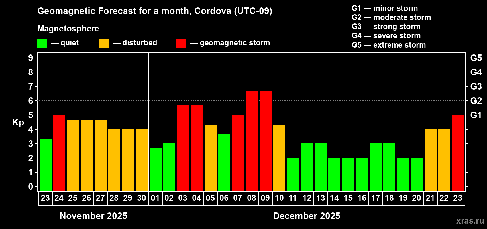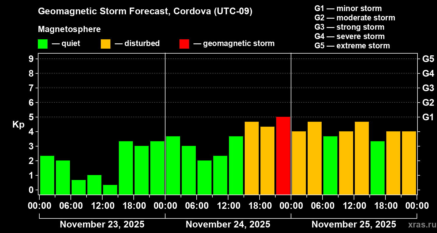 Geomagnetic storm forecast in Cordova for Nov 23, 2025