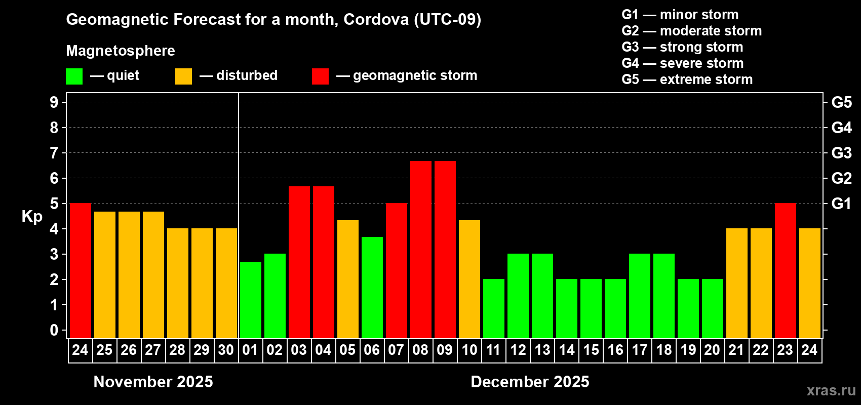 Geomagnetic storm forecast in Cordova for Nov 24, 2025