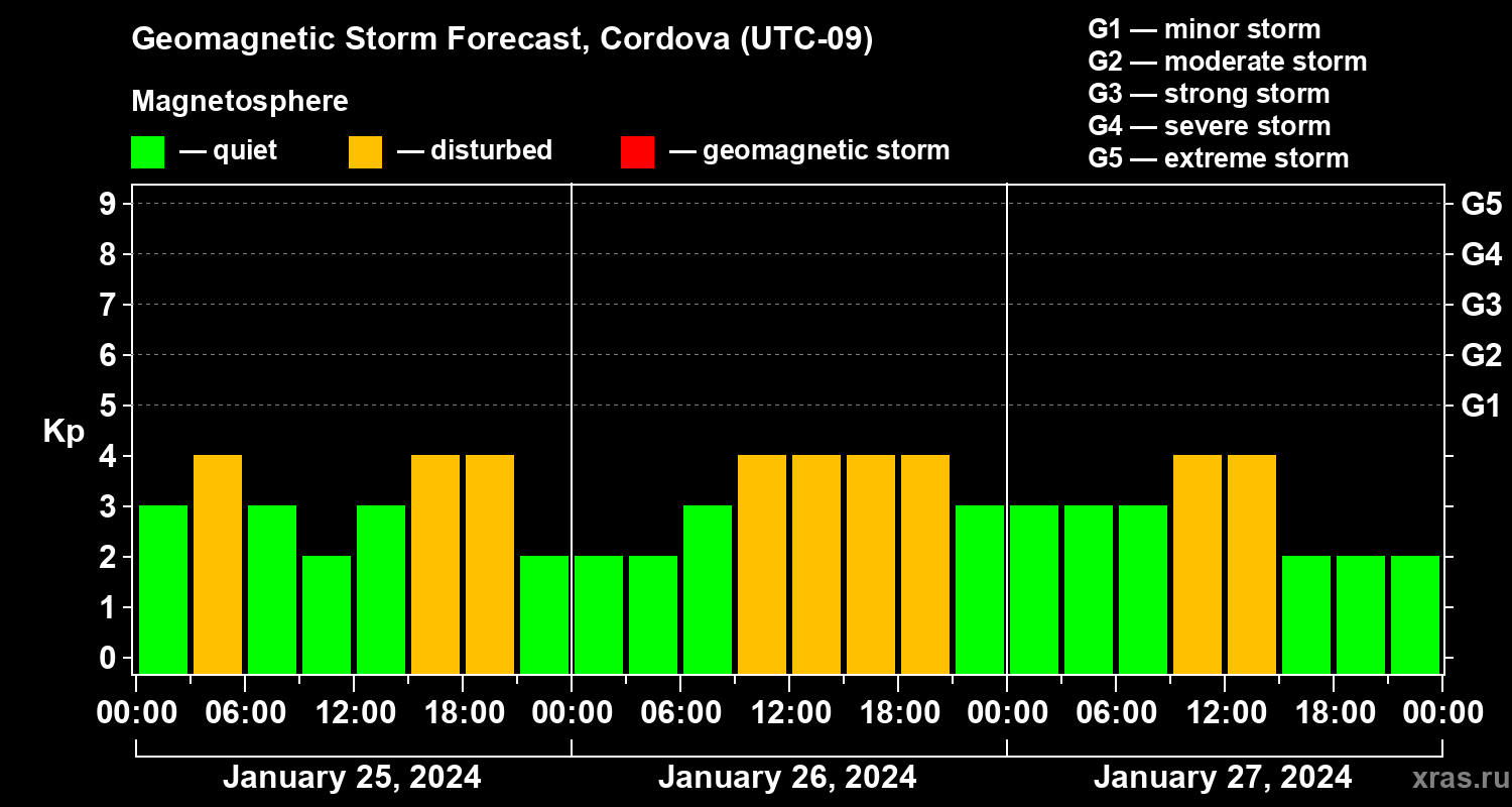 Geomagnetic storm forecast in Cordova for Jan 25, 2024