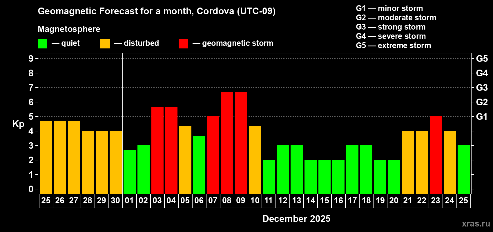 Geomagnetic storm forecast in Cordova for Nov 25, 2025