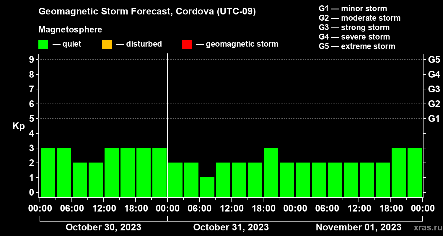 Geomagnetic storm forecast in Cordova for Oct 30, 2023
