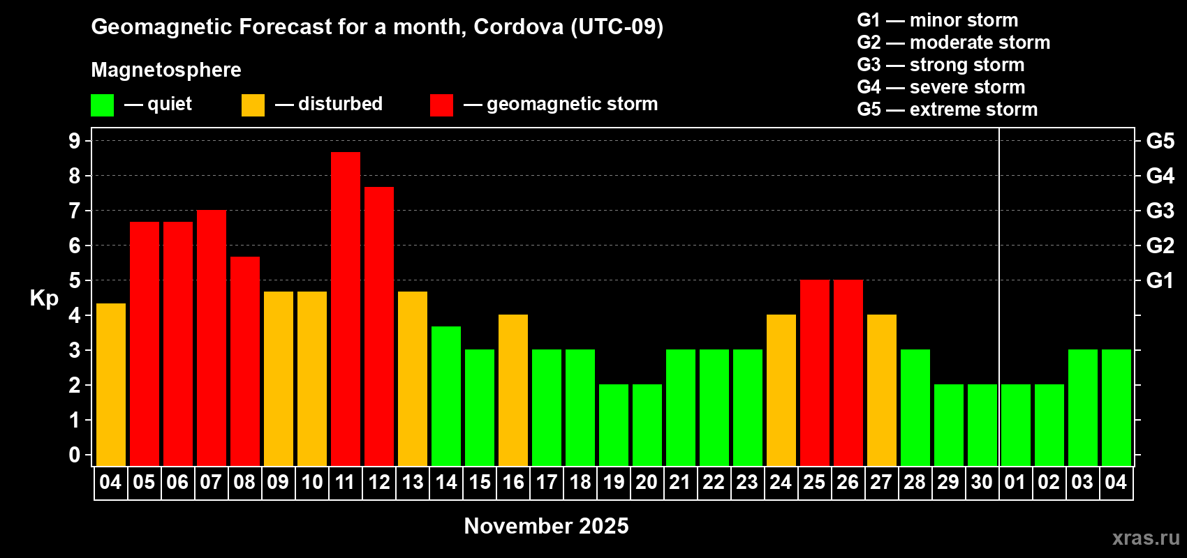 Geomagnetic storm forecast in Cordova for Nov 04, 2025