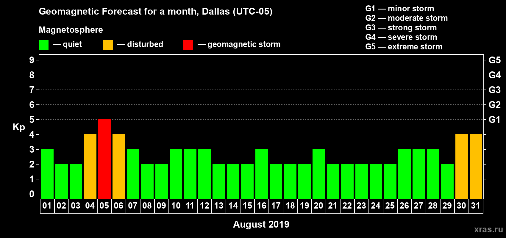 Geomagnetic storm forecast in Dallas for Aug 01, 2019
