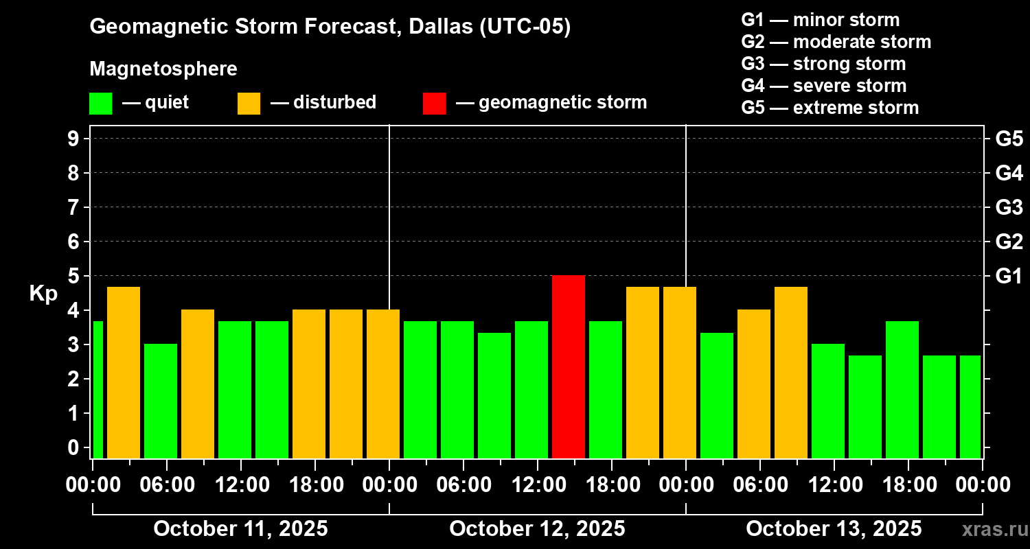 Geomagnetic storm forecast in Dallas for Oct 11, 2025
