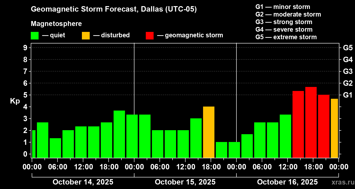 Geomagnetic storm forecast in Dallas for Oct 14, 2025